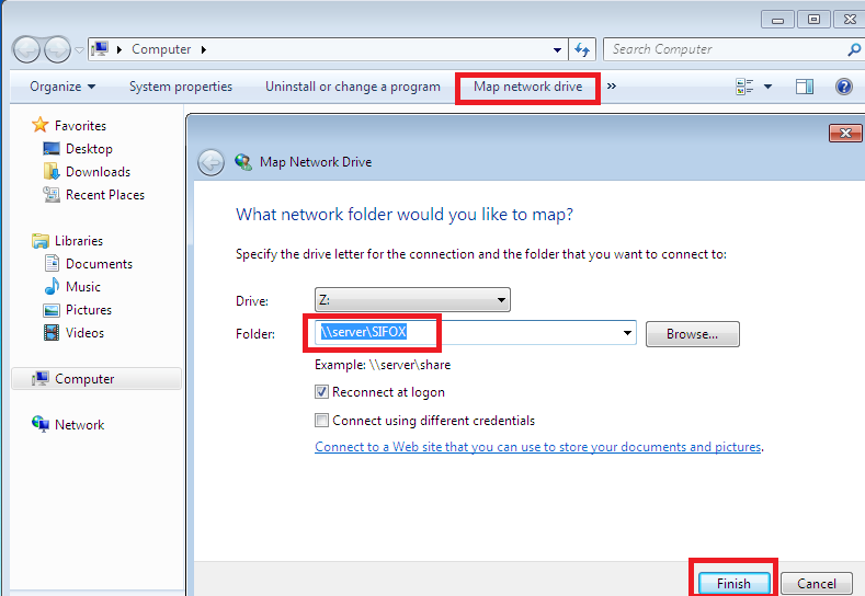 - Se o servidor tiver a pasta SIFOX partilhada, é necessário que no posto cliente mapeie essa pasta para \\server\SIFOX, por exemplo Z:\, onde server é o nome ou IP do servidor onde está alojado o share SIFOX.