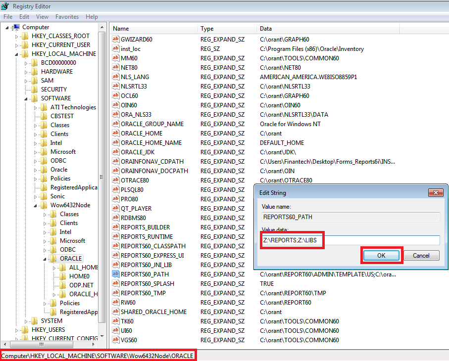 1) De seguida, para sistemas 32 bits, basta ir ao registry do Windows e no caminho HKLM\SOFTWARE\ORACLE alterar a chave REPORTS60_PATH que terá de apontar para a localização correcta dos reports e das libs.