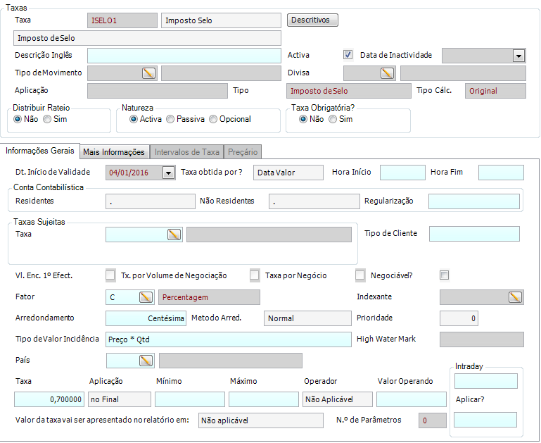 Nota: Pode criar os seguintes tipos de taxas sujeitas Imposto de Selo, Imposto Selo s/Taxa Bolsa, Imposto Selo s/Compensação e Imposto Selo Trf.