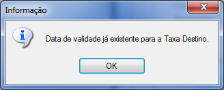 Para ultrapassar este erro o utilizador não irá conseguir gravar a taxa com esta data de início de validade pelo que deverá indicar outra data de início de validade. Caso o utilzador pretenda herdar mesmo esta data deve ir ao ecrã de taxas, pesquisar a taxa destino e no grupo informações gerais eliminar o registo com essa data. Depois já poderá gravar o registo.