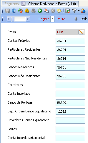 Este form permite parametrizar as contas terceiras de lançamento, distinguindo-as conforme o tipo de terceiro (particulares, particulares residentes, particulares não residentes, bancos residentes, bancos não residentes, corretores, carteira própria). Assim, por exemplo, para particulares residentes dever-se-ia preencher os dígitos 367020 (classe 3 – recursos alheios, conta 36 credores, subconta 367 credores por operações de valores mobiliários de outros residentes). É com base na informação aqui registada que o Sifox vai criar as contas de terceiros – clientes – na contabilidade (clientes particulares, institucionais ou contas próprias).