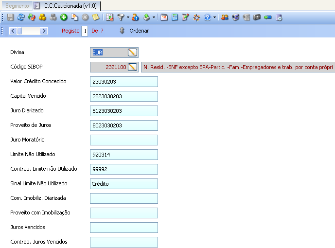 Este form permite parametrizar as contas utilizadas no processo das Contas Correntes Caucionadas. Estas contas são parametrizadas em função do código da divisa e do sector institucional do Banco de Portugal (SIBOP) associado a cada cliente no form de dossier de títulos. Se for usada uma divisa diferente de Euros e se a mesma não estiver parametrizada, ele usará as parametrizações de Euros.