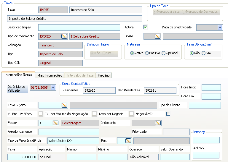Este form serve para registar as contas relativas a encargos utilizados em movimentos do financeiro, conservadoria, transferências, encargos passivos de derivados, encargos passivos e encargos activos do tipo outras taxas em efectuados.Podem parametrizar-se contas diferentes para clientes residentes e não residentes.
