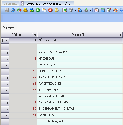 Este form permite tipificar a descrição dos movimentos que são introduzidos manualmente na contabilidade ou os associados à reversão dos movimentos manuais. Assim, aquando o registo dos movimentos associados ao lançamento de uma determinada operação, na contabilidade, o utilizador poderá limitar-se a indicar o código identificativo do movimento, que o Sifox encarrega-se de o descrever com base na parametrização feita neste form.