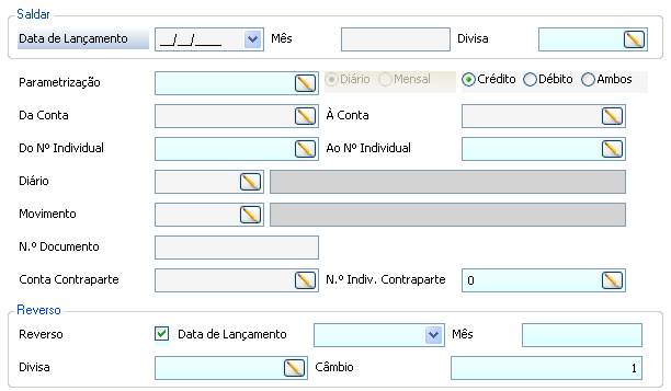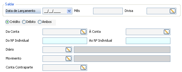 Do intervalo de contas seleccionadas para o efeito, pode-se ainda escolher saldar apenas as que apresentarem saldo credor (Crédito), ou apenas as que apresentarem saldo devedor (Débito), ou saldar todas as contas do intervalo independentemente do seu tipo de saldo (Ambos). De forma análoga aos demais procedimentos automáticos, a conta contraparte indicada pelo utilizador deverá ter sido aberta previamente no(s) plano(s) de trabalho(s) envolvido(s). A data do documento associada a este movimento automático será a data de lançamento parametrizada neste form. O mês, em princípio, será igual ao da data, no entanto confere-se a possibilidade de o alterar por forma a permitir fazer lançamentos no mês 0 (saldos iniciais), 13, 14 e 15 (fecho de contas). A divisa permite especificar o plano de trabalho (ou base – divisa BAS) em que esses lançamentos são feitos. É necessário indicar o diário onde deverá ser registado o movimento, bem como uma descrição do mesmo.