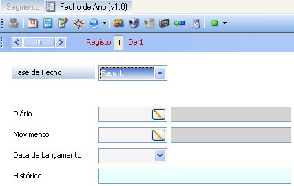 O Fecho do ano é composto por 3 fases. A primeira e a terceira fase requerem a parametrização prévia das contas a movimentar. Estas duas fases são executadas através do mesmo form. Obrigam ao preenchimento do código do Diário para o qual vai proceder-se ao fecho, bem como do código do movimento e da data de lançamento. Possibilita, ainda o registo de observações no histórico.