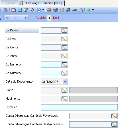 Este form permite proceder ao acerto automático de diferenças cambiais e só pode ser utilizado nos casos em que existem diversas divisas definidas como divisas de trabalho (USD, ...) e uma divisa base (EUR) que é, simultaneamente, a divisa em que está expresso o plano base. Este form permite apurar as diferenças cambiais originadas em cada plano de trabalho, expressas e lançadas na divisa base. Estas diferenças resultam das variações das taxas de câmbio utilizadas na conversão de cada uma das divisas de trabalho para o plano base.