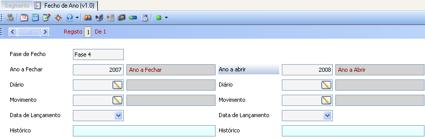 Este form vai executar a quarta fase do fecho, em que saldam todas as contas do ano que está a ser fechado e lançam-se saldos iniciais, nessas contas, mas já no ano contabilístico seguinte. A única diferença entre este form e os forms da fase I e III, prende-se com o facto de se ter de indicar o ano a abrir.
