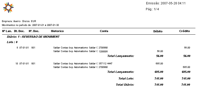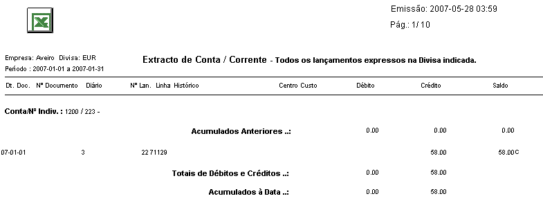 Este mapa descreve os movimentos, por ordem de datas, para cada conta de lançamento. Indica, ainda, o saldo inicial, totais de débitos e de créditos e o saldo final. Permite ainda a exportação para Excel.
