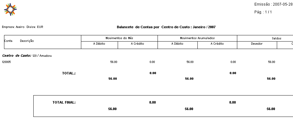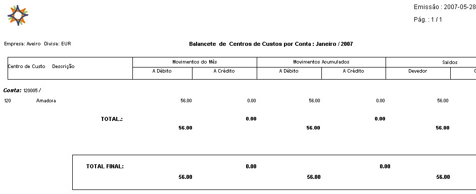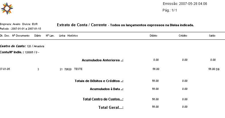 Este mapa descreve, para cada conta de lançamento, os movimentos, por ordem de datas e por Centro de Custos. Indica, ainda, o saldo inicial, totais de débitos e de créditos e o saldo final (acumulados à data).