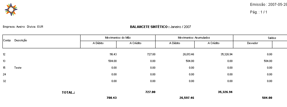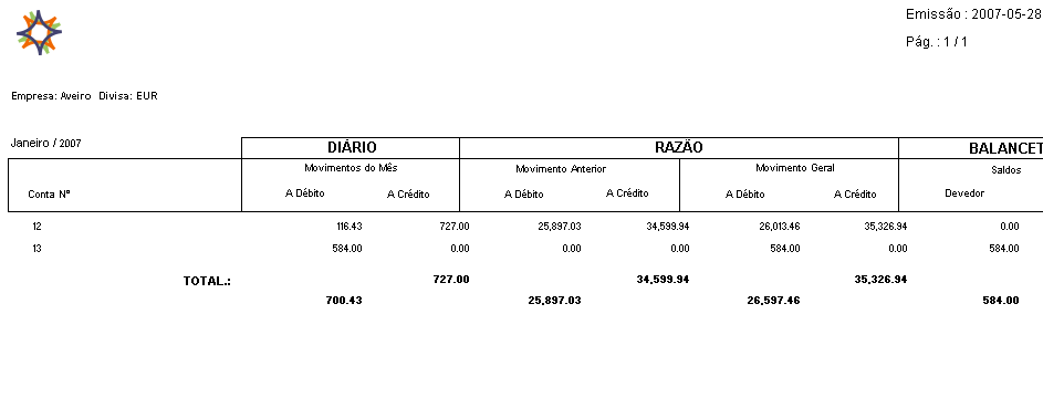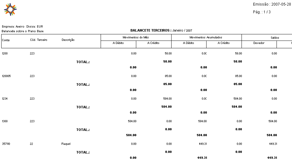 Este mapa resume os lançamentos, por diário para cada uma das contas de lançamento de terceiros movimentadas no período de tempo em análise. Para o diário seleccionado indica, por conta, os montantes totais a débito e a crédito e os saldos respectivos. Este balancete permite consultar, para cada conta de terceiros, o montante total a débito e a crédito, relativo ao mês e os montantes acumulados (de todos os meses anteriores e do próprio mês). Esta informação é utilizada para conferir processos automáticos de registo de movimentos.