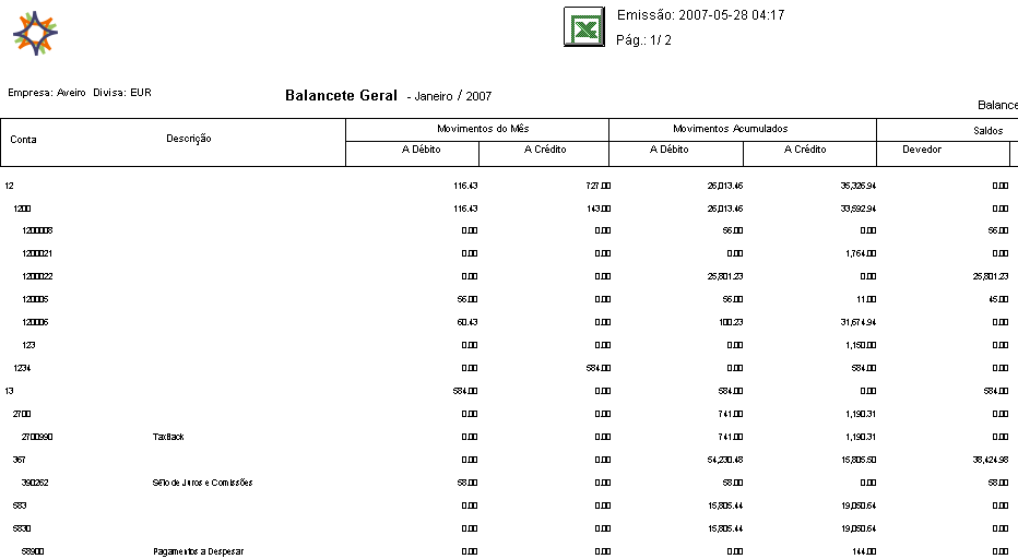 v Movimento Geral – indica, para cada conta, o montante acumulado a débito e a crédito, isto é, indica os montantes a débito e a crédito, incluindo os valores referentes ao mês em análise.
