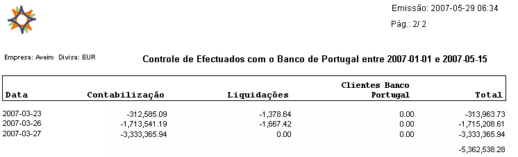 Este mapa sintetiza os movimentos da instituição utilizadora do Sifox com o Banco de Portugal. Esta informação serve para verificar se os registos na contabilidade estão correctos. Este mapa soma, por data, os movimentos feitos nos diários automáticos relativos a contratas (C e S) e o diário relativo a liquidações (L).