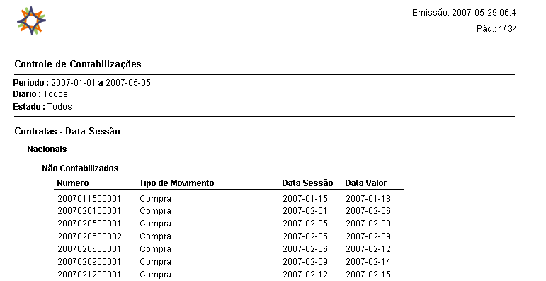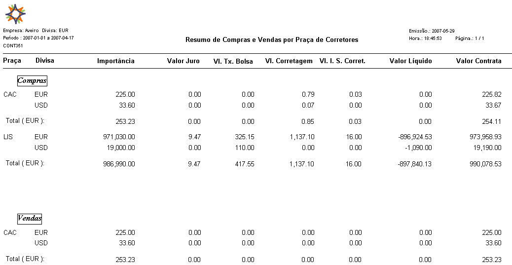 Este mapa serve para conferir os valores registados na contabilidade do Sifox. Recolhe informação do módulo Vista do Sifox, relativamente a compras e vendas, por praça e divisa, indicando a importância, o valor dos juros, o valor da taxa de bolsa, das corretagens, imposto selo sobre corretagens, valor líquido e valor da contrata.