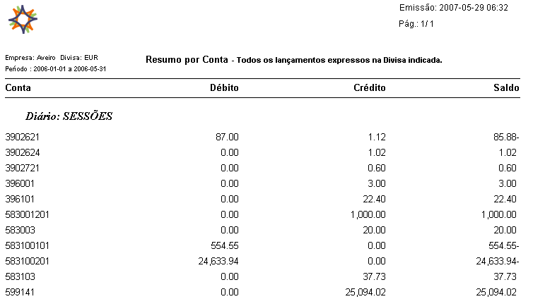 v Crédito – montante a crédito para cada conta movimentada no período de tempo indicado pelo utilizador.