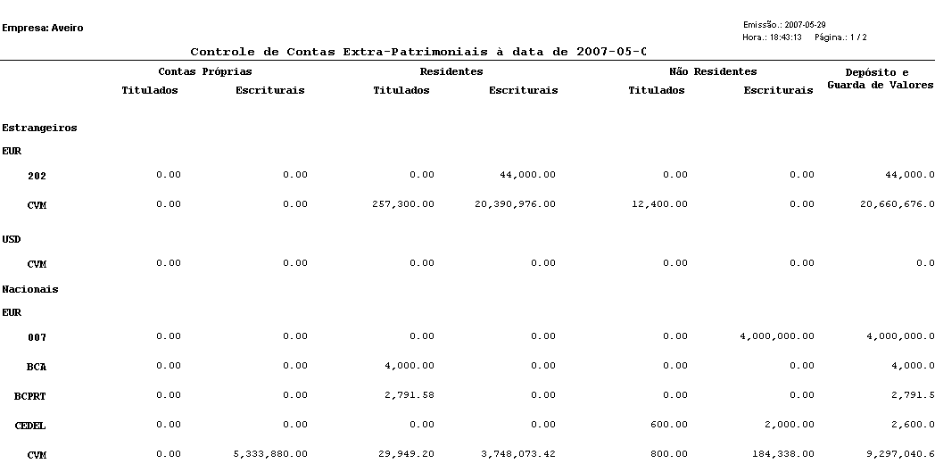 Este mapa fornece um resumo das contas extrapatrimoniais (contas que reflectem os títulos de terceiros à guarda da instituição onde está instalado o Sifox), distinguindo-as conforme o tipo de contas: contas próprias, de residentes, não residentes e contas associadas ao depósito e guarda de valores. Dentro de cada um destes grupos distinguem-se os títulos de acordo com a sua natureza (escriturais ou titulados). As contas são, ainda, distinguidas pela moeda em que são emitidos. Esta informação é retirada directamente do Sifox e os valores indicados representam, para cada categoria, o produto da quantidade de títulos pelo respectivo valor nominal. Este mapa serve de apoio ao registo manual dos movimentos referentes às contas extrapatrimoniais, nomeadamente as contas do tipo 95 e 96.