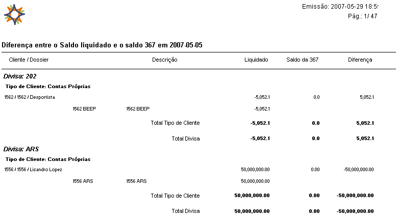 Este mapa apresenta uma relação por cliente/Dossier, com o valor liquidado na conta à ordem associada por defeito a cada dossier, e o valor contabilizado na respectiva 367, para efeitos de controle de descobertos financeiros.