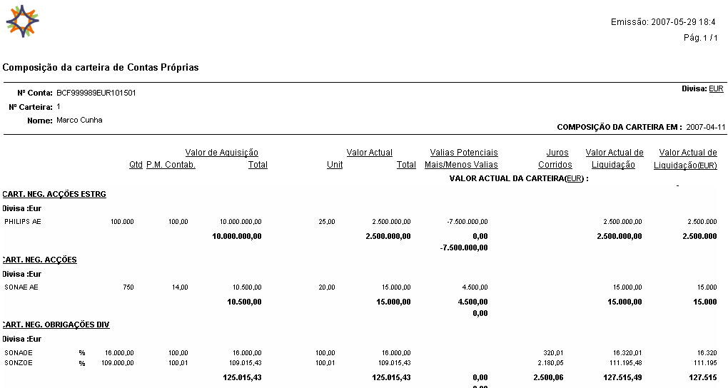 Este mapa indica, por título, o valor de aquisição, o valor actual, calculado com base na última cotação disponível do título e compara-os por forma a determinar as mais ou menos valias potenciais. Além disto, informa sobre os juros corridos, o que, juntamente com o valor actual permite calcular o valor actual da liquidação (soma dos juros corridos com o valor actual). O valor actual de liquidação é expresso na moeda do título e em Euros.