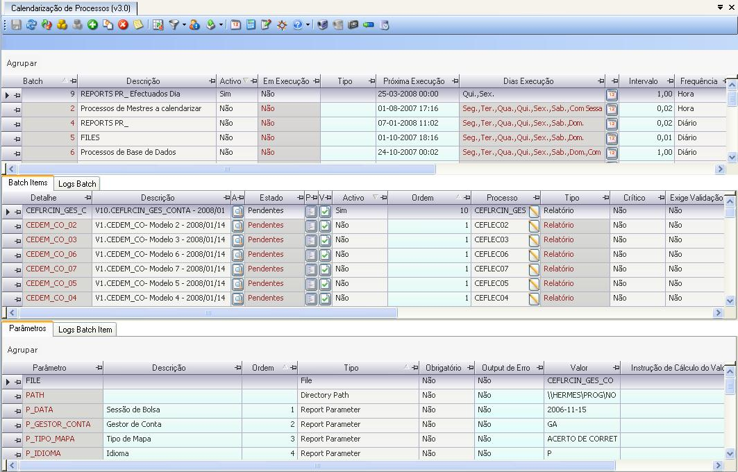 A calendarização de processos permite a programação e acompanhamento da execução de variados processos. Esta encontra-se estruturada em três partes que se interrelacionam. Assim temos a um nível superior os “Batch” e as respectivas definições para os mesmos. Para cada um dos Batch encontramos o conjunto de Items que o constituem. Em último lugar estão os parâmetros que fazem parte de cada um dos Batch Items.