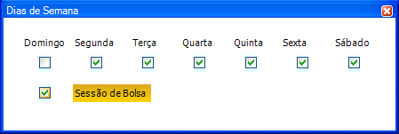 Dias Execução – Dias da Semana em que o Processo é executado. Ao carregar em “Calendário” aparece a seguinte janela onde o utilizador pode especificar se o batch vai correr apenas nas sessões de bolsa (que são definidas no Sifox BackOffice) ou nos todos os dias parametrizados independentemente se for uma sessão de bolsa ou não.