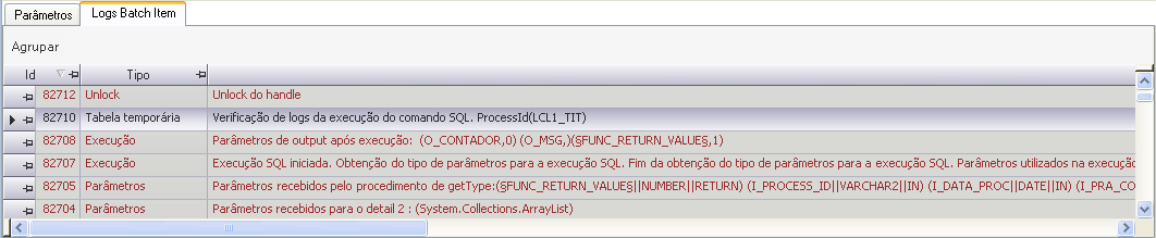 Tipo – Fase em que o processo se encontra. Pode assumir os seguintes valores: Início, Lock, Verificação Parâmetros, Leitura de Ficheiro, Execução, Escrita de Ficheiro, Tabela Temporária, Parâmetros, Logs, Unlocks, Sucesso e Erro.