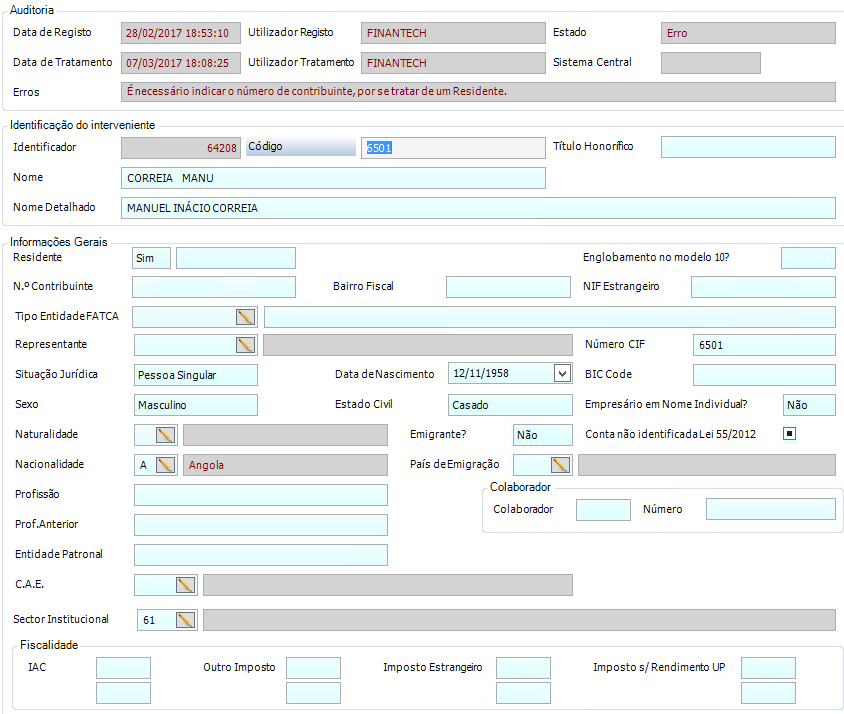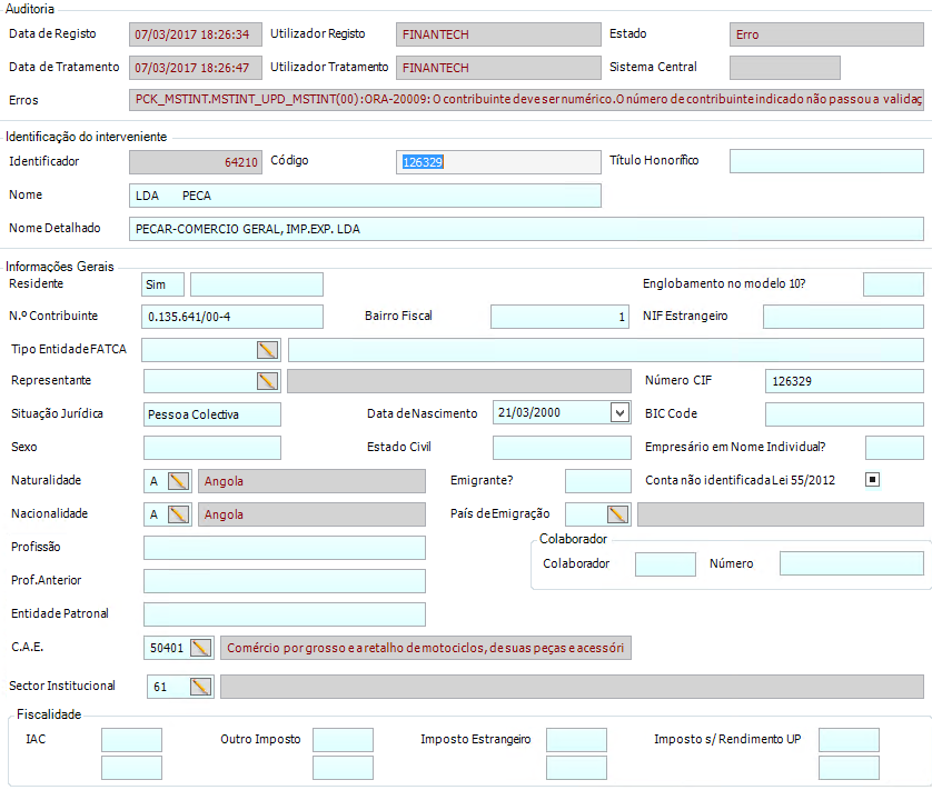 O interveniente (neste caso, o que diz respeito à entidade 6501, como veremos mais à frente) veio sem a informação do Nº Contribuinte e este dado é obrigatório para o registo do cliente no backoffice da aplicação.