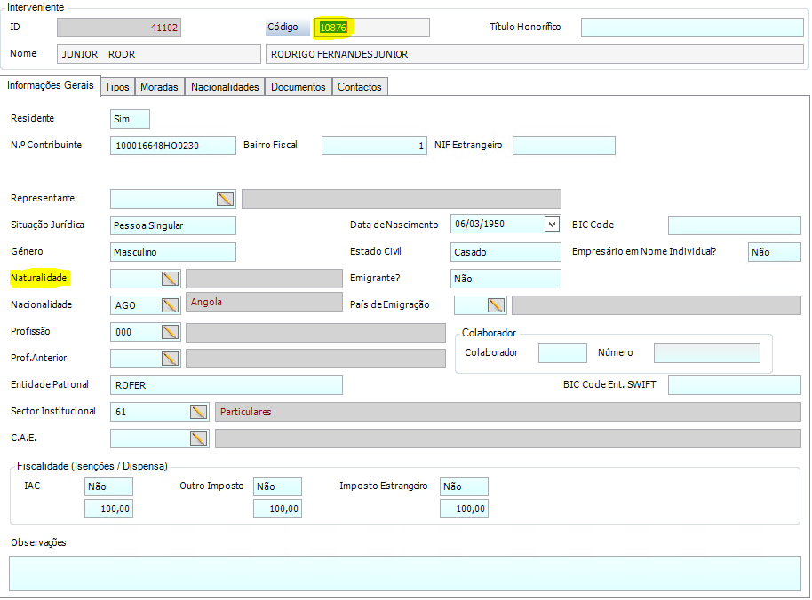 Pesquisar o interveniente pelo campo Código, neste caso, com o código 10876