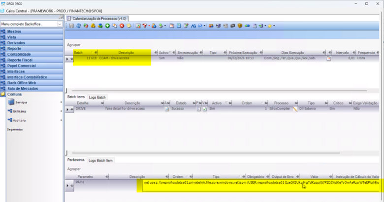 No ecrã da Calendarização de Processos verificar qual o Bath que dá aceeso ao Drive da CCAM.
